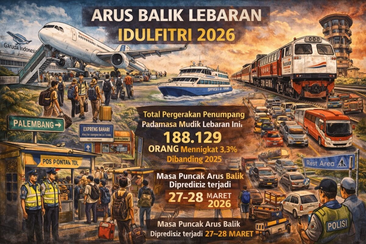 Palembang | Usai merayakan Hari Raya Idulfitri 1447 Hijriah bersama keluarga di kampung halaman, para pemudik kini mulai bersiap kembali ke kota asal masing-masing. Pergerakan arus balik Lebaran 2026 pun mulai terasa di berbagai moda transportasi, baik darat, laut, maupun udara. Berdasarkan sejumlah prediksi dari instansi terkait, puncak arus balik diperkirakan akan terjadi pada 27 hingga 28 Maret 2026.