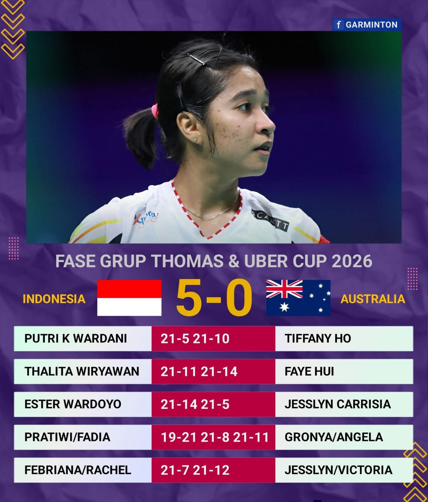 DENMARK – Tim Uber Indonesia dikomandoi sang kapten Putri Kusuma Wardani (PKW) tadi malam hingga jelang fajar pagi ini Senin (27/4/2026) sukses membantai tim Uber Australia secara telak 5-0.