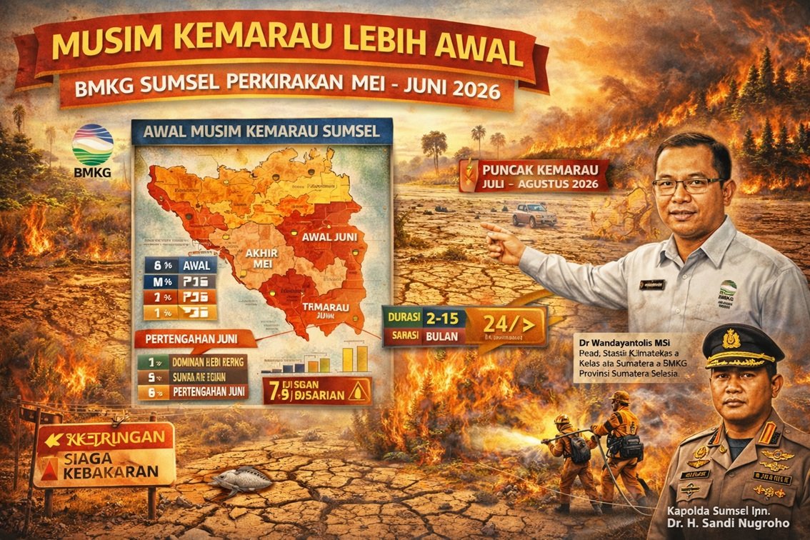 Palembang | Badan Meteorologi, Klimatologi, dan Geofisika atau BMKG memprediksi musim kemarau tahun 2026 di wilayah Sumatera Selatan akan datang lebih awal dibandingkan kondisi normal. Prediksi ini menjadi perhatian serius, mengingat potensi dampaknya terhadap lingkungan, pertanian, hingga meningkatnya risiko kebakaran hutan dan lahan (karhutla).