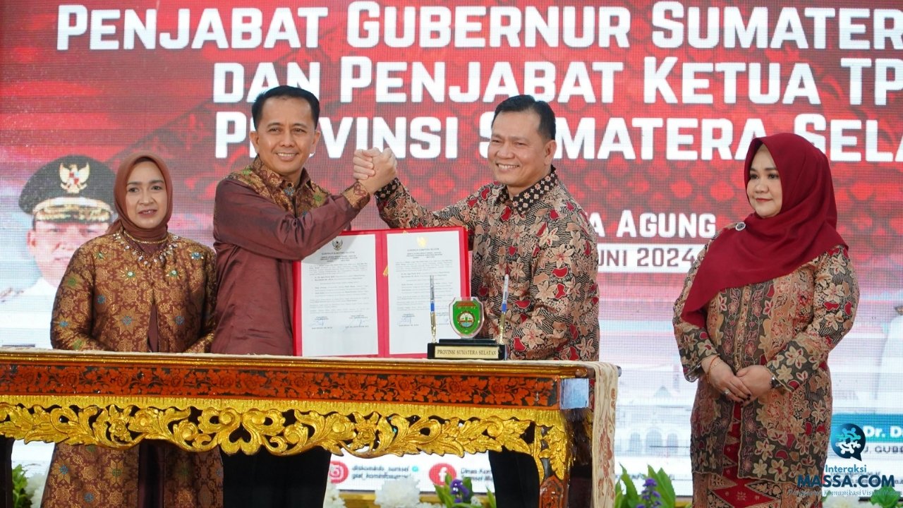 Penandatangan serah terima jabatan Gubernur Sumsel di acara pisah sambut Penjabat (Pj) Gubernur Sumatera Selatan (Sumsel) pada Selasa (25/6/2024) malam. Foto: dok/Pemprov Sumsel.