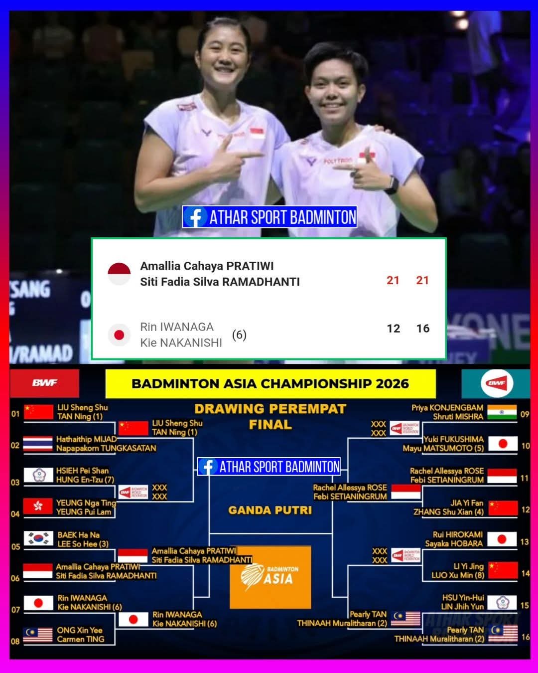 Kemenangan ini membawa Fadia/Amalia melangkah ke babak perempat final, sekaligus menjaga asa Indonesia untuk meraih prestasi gemilang di turnamen bergengsi tingkat Asia tersebut.
