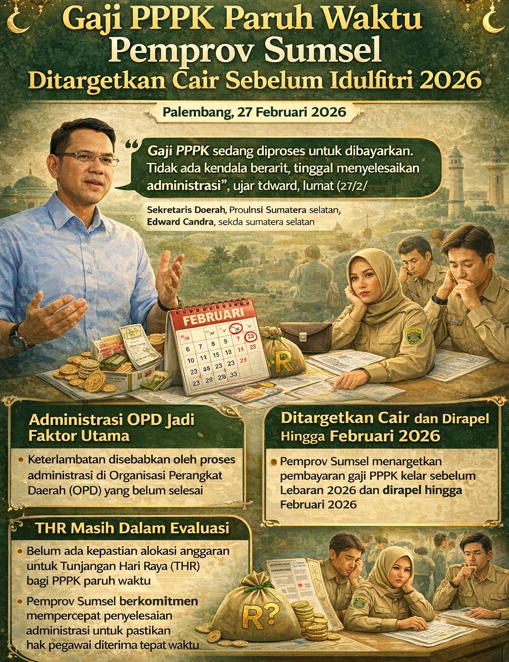 Palembang | Menjelang Hari Raya Idulfitri 2026, para Pegawai Pemerintah dengan Perjanjian Kerja (PPPK) paruh waktu di lingkungan Pemerintah Provinsi Sumatera Selatan masih diliputi ketidakpastian. Bukan terkait tugas atau penempatan kerja, melainkan hak dasar berupa gaji yang hingga akhir Februari belum juga diterima.
