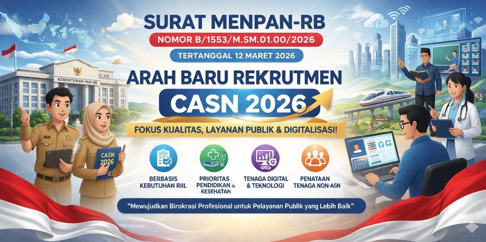 Sekedar informasi, Surat Nomor B/1553/M.SM.01.00/2026 tertanggal 12 Maret 2026 yang menjadi pedoman strategis dalam pengelolaan dan pengusulan kebutuhan Aparatur Sipil Negara (ASN), termasuk rekrutmen Calon Aparatur Sipil Negara (CASN) tahun 2026.