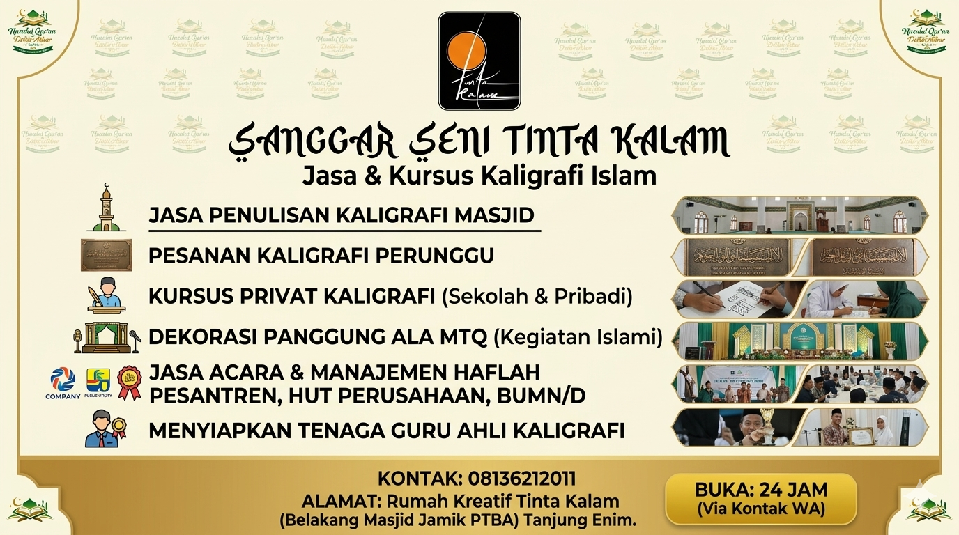 TANJUNG ENIM – Di sebuah sudut Tanjung Enim, tepat di belakang Masjid Jamik PTBA, berdiri sebuah ruang sunyi yang justru penuh suara—bukan suara gaduh, melainkan bisikan huruf-huruf yang ditata dengan kesabaran. Di sanalah Sanggar Seni Tinta Kalam menumbuhkan kembali tradisi lama: merawat keindahan kaligrafi Islam sebagai jalan seni sekaligus jalan dakwah.