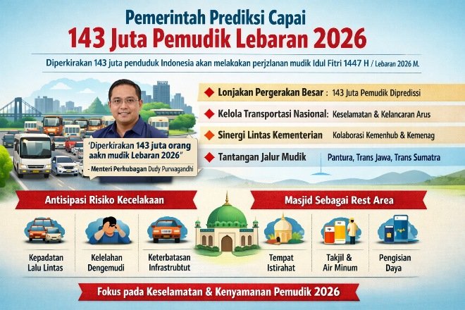 JAKARTA – Pemerintah Republik Indonesia melalui Kementerian Perhubungan memperkirakan sekitar 143 juta penduduk Indonesia yang akan melakukan perjalanan pulang kampung mudik Idul Fitri 1447 H/ Lebaran 2026 M.