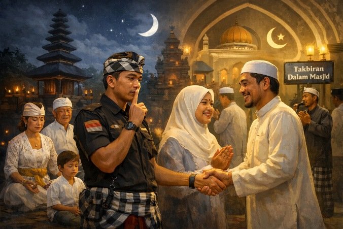 Ketika takbir dilantunkan secara sederhana di dalam masjid dan Bali tetap tenggelam dalam keheningan Nyepi, dunia dapat melihat satu pesan penting dari Indonesia. Bahwa perbedaan bisa berjalan berdampingan dalam damai. Semoga umat Muslim di Bali dapat dengan tenang melaksanakan ibadah suci Ramadan dan pelaksanaan Idul Fitri 1447 H. **