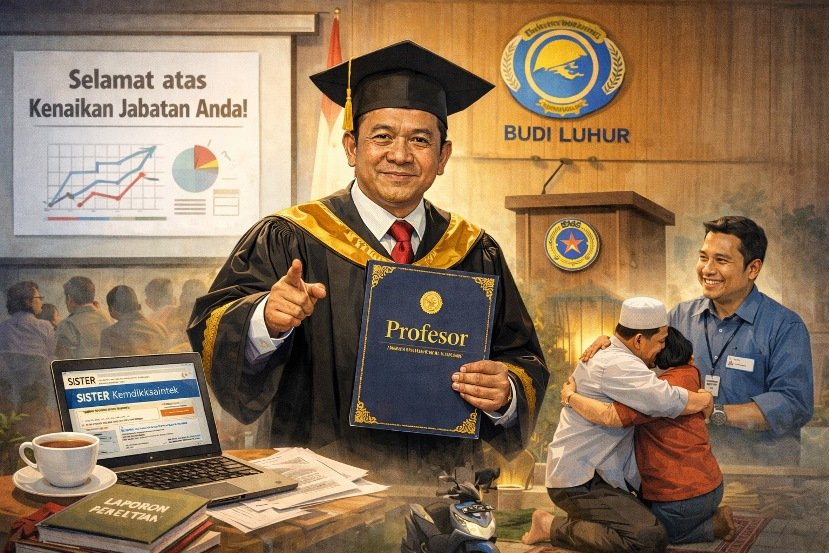 Karena tugas utama sudah selesai, saya membuka laman http://www.sister.kemdiktisaintek.go.id/www.sister.kemdiktisaintek.go.id. Setelah login, langsung bagian menuju jenjang kenaikan karier. Begitu diklik tertera tulisan “Selamat atas Kenaikan Jabatan Anda.” Membaca itu semua rasa bercampur aduk. Beberapa teman yang duduk di samping memberi ucapan selamat. Saya langsung keluar ruangan menuju gedung SDM menemui Mas Uno, operator sister Universitas Budi Luhur. “Terima kasih, Mas,” kata saya berkaca-kaca. “Selamat, Bapak,” balas Mas Uno.