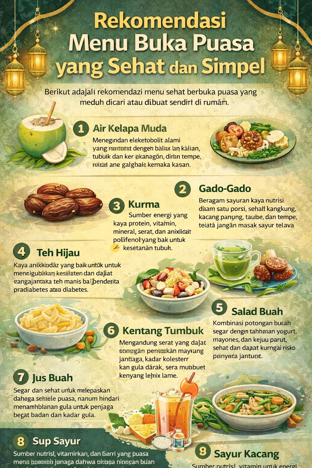 Memilih menu buka puasa yang sehat dan simpel membantu tubuh tetap bugar selama Ramadan. Kunci utamanya adalah mengutamakan makanan alami, tinggi serat, cukup protein, dan rendah gula tambahan agar energi tetap stabil hingga waktu sahur. (*)