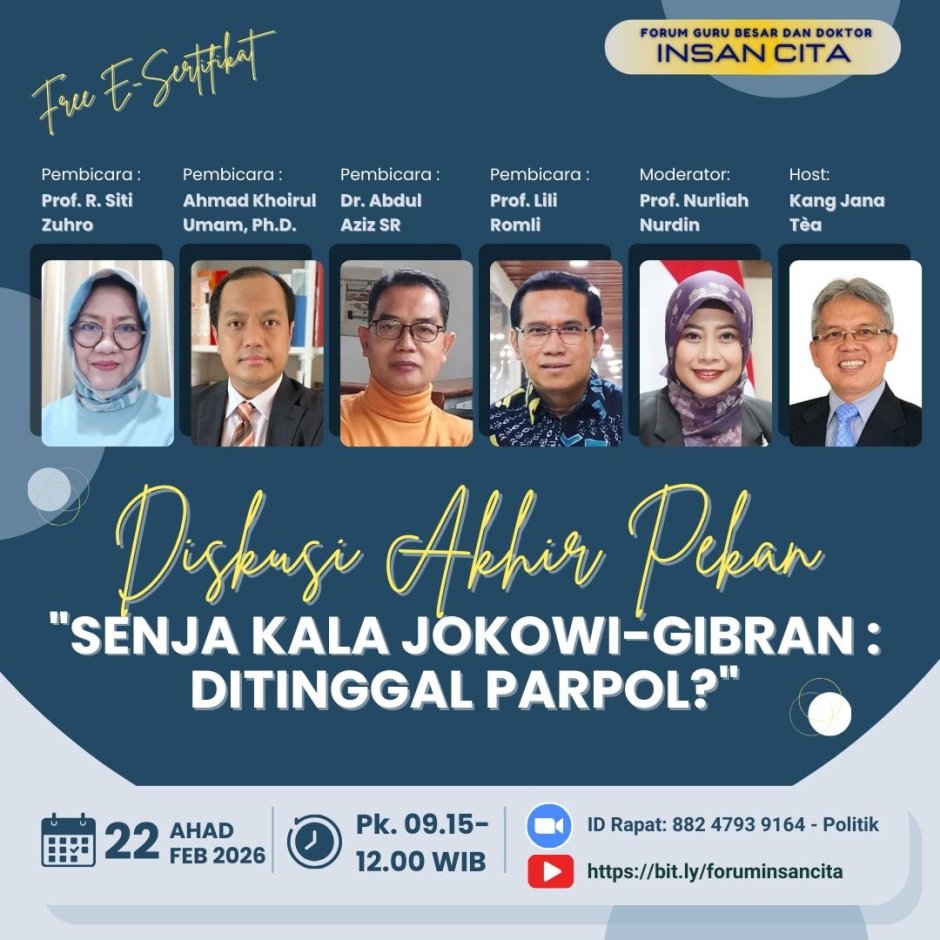 Pemandu Diskusi Akhir Pekan bertema “Senja Kala Jokowi-Gibran Ditinggal Parpol?”, Sujana Sulaiman atau akrab disapa Kang Jana Tea melalui ponsel, Jumat (20/2/2026) menyampaikan, seminar nasional ini digelar oleh sebuah forum yang tumbuh dari keluarga besar alumni Himpunan Mahasiswa Islam yakni Forum Guru Besar dan Doktor Insan Cita. Akan dilaksanakan pada Minggu (22/2/2026) pukul 09.00 wib.