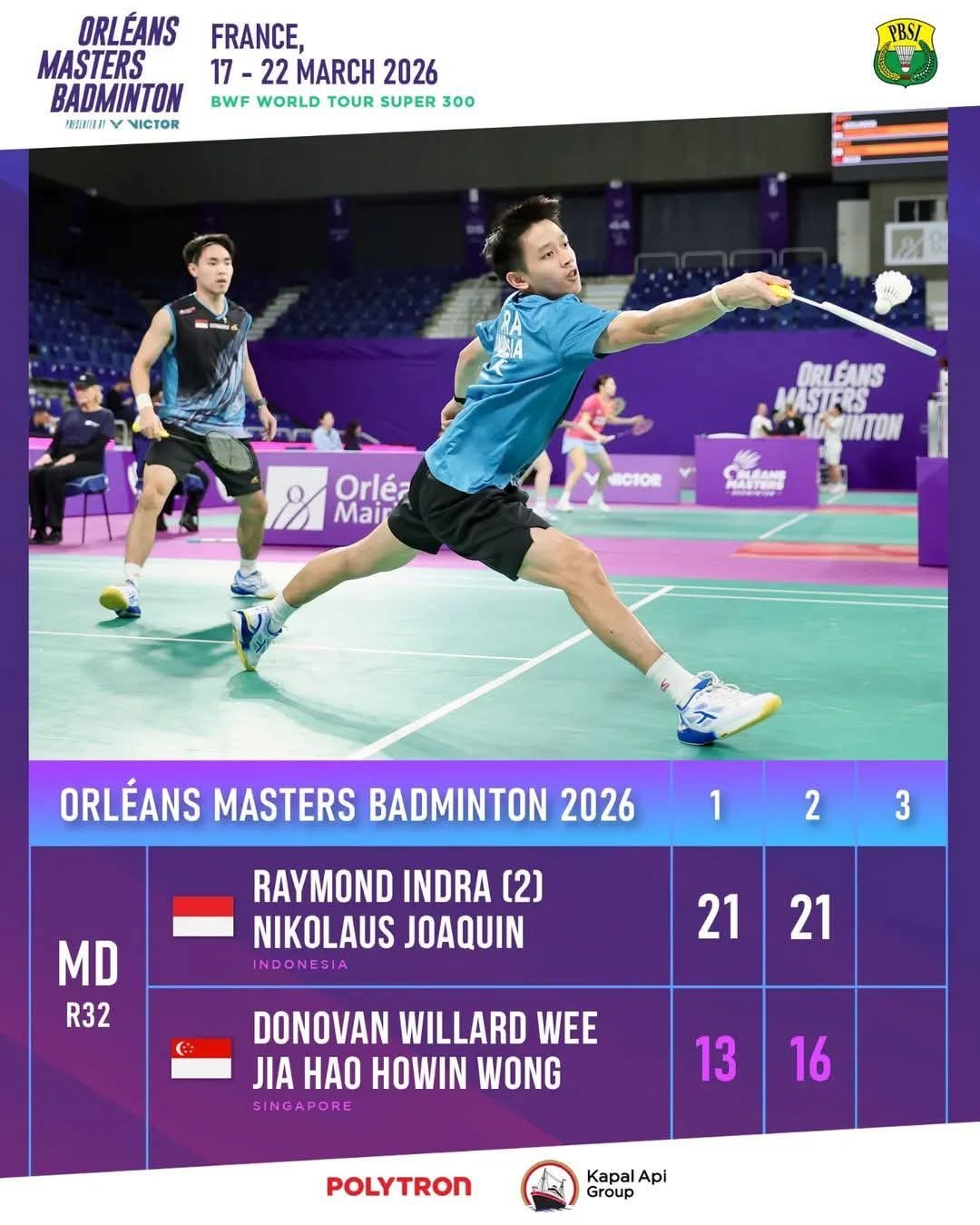 Raymond/Joaquin sukses menumbangkan wakil terbaik ganda putra Singapura Donovan Willard Wee/Jia Hao Howin Wong secara straight game (dua set langsung).
