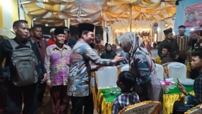 Meskipun sudah larut malam, kehadiran Yulius Maulana dalam acara Aqiqah Aleena Ramadani tetap disambut antusias oleh warga Desa Suka Makmur SP3 Palmbaja, Kecamatan Gumay Talang, Kabupaten Lahat, Minggu (14/7/2024).