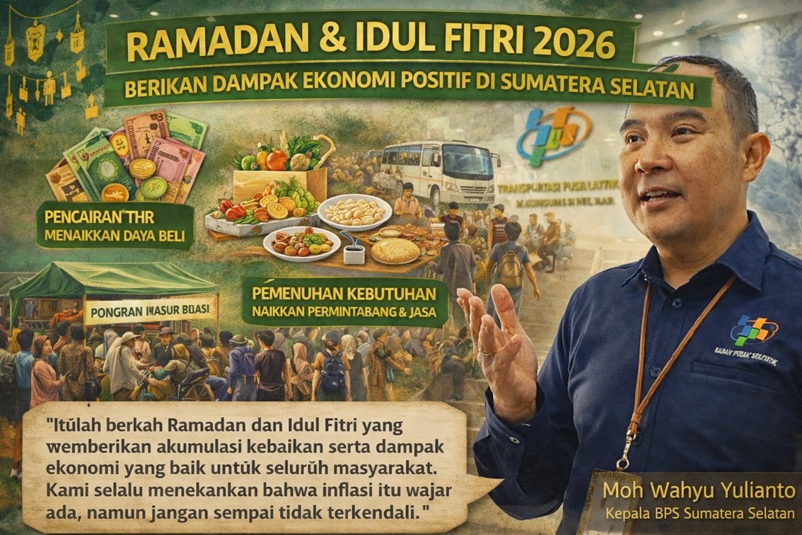 Kepala Badan Pusat Statistik Sumatera Selatan, Moh Wahyu Yulianto, menyampaikan bahwa lonjakan aktivitas masyarakat selama Ramadan hingga Lebaran memberikan kontribusi signifikan terhadap perputaran ekonomi daerah.